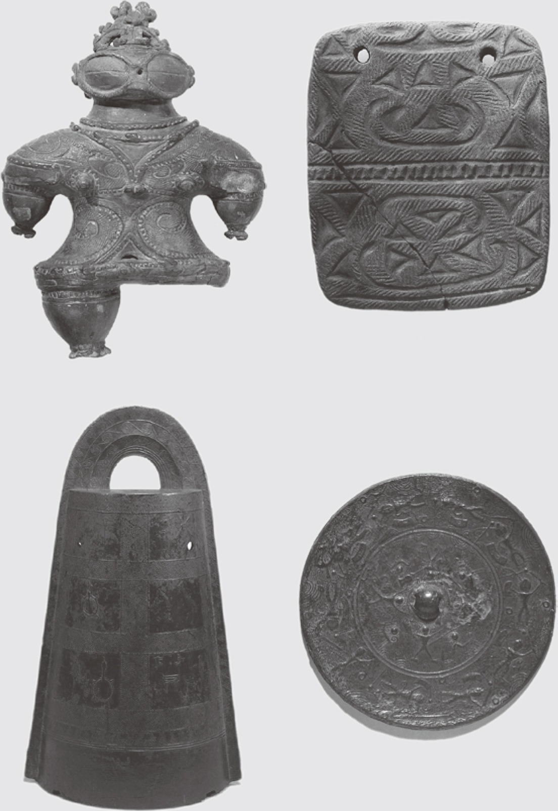 上左绳文时代晚期的黏土雕像,上右绳文时代晚期的泥板,下左弥生时代的铜铎(青铜器),下右古坟时代的狩猎纹镜(青铜器)