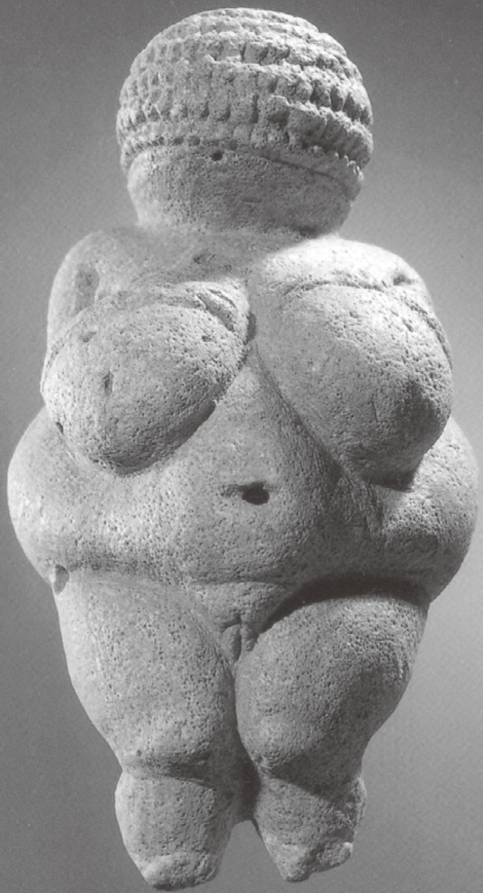 旧石器时代的女性裸体雕刻《维伦多夫维纳斯》(Venus of Willendorf),特别夸张双乳、肚腹和臀部在身体中的比例,是一个象征多产的形象。