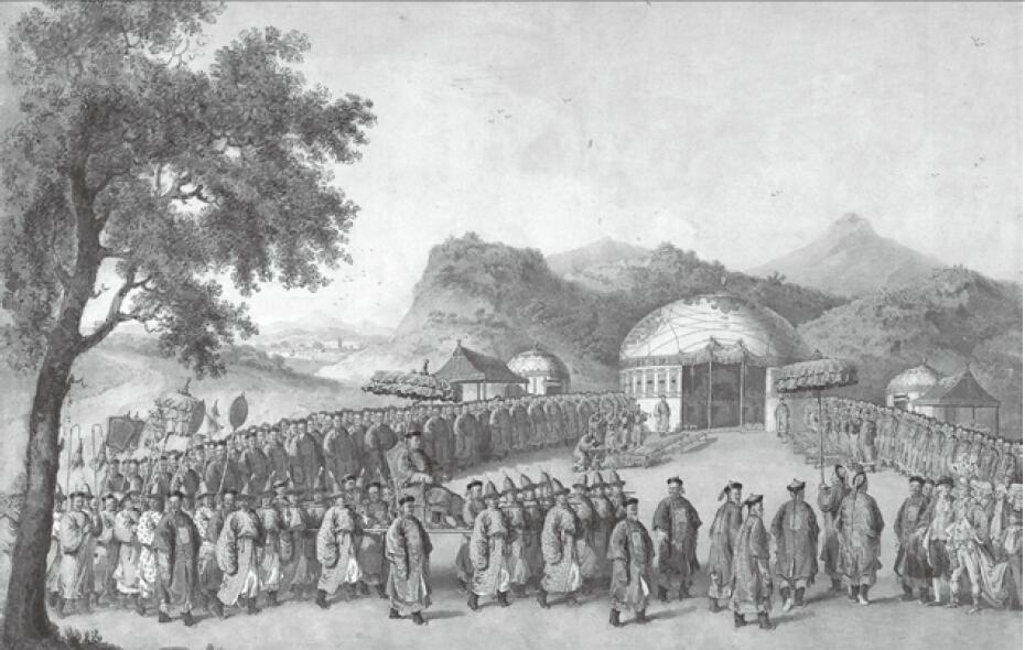 乾隆皇帝接见马戛尔尼的情景。18世纪末以后,封闭、缓慢发展的中国开始面临西方的挑战。
