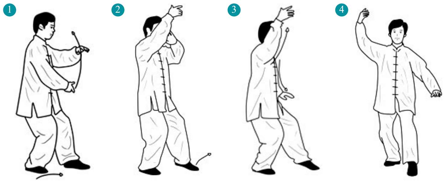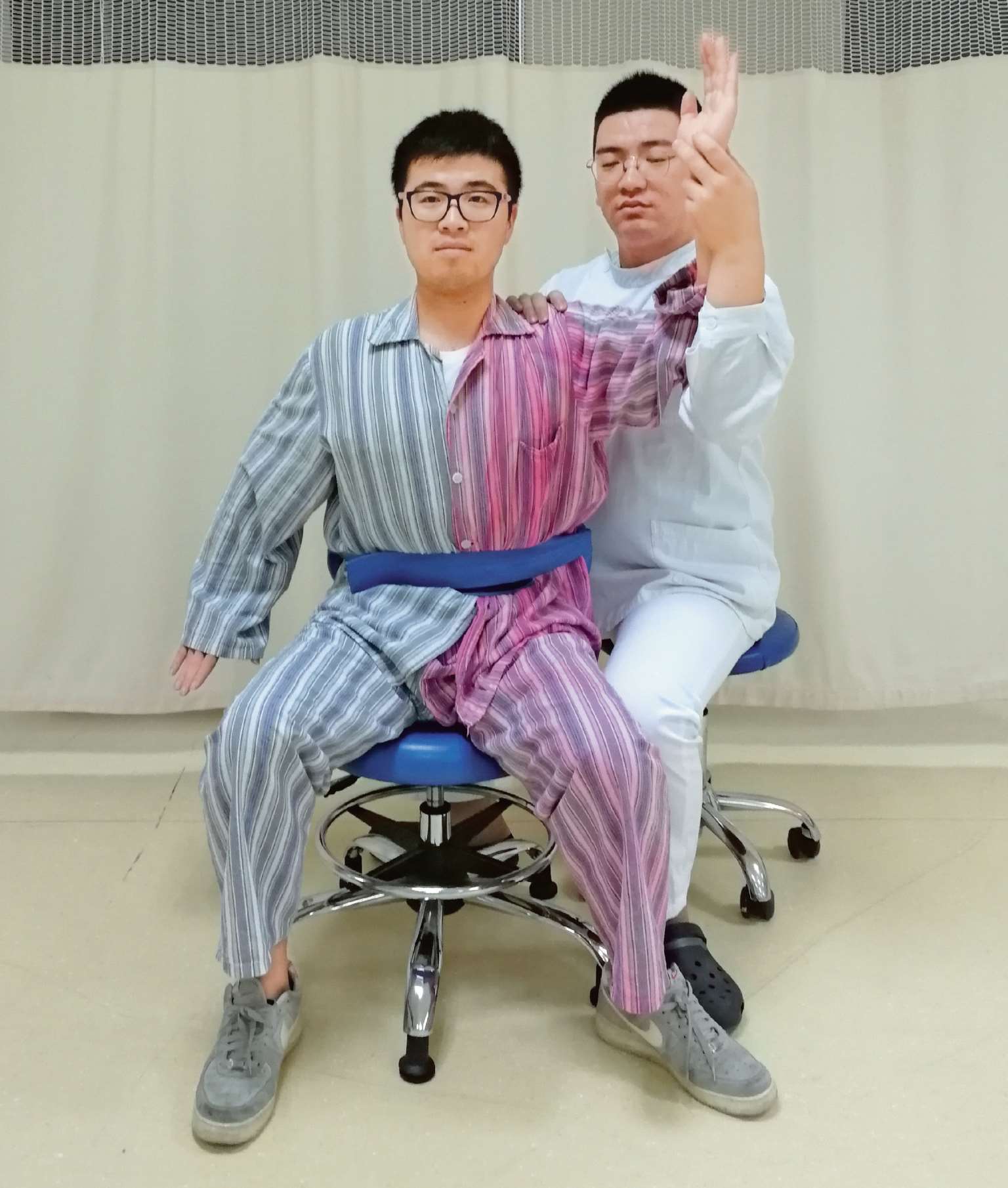 经过改良的白鹤亮翅,双手交替呈对拉之势,应用由合到分,由分到合的过程,增加患侧肩关节外旋,有效改善脑卒中患者常见的上肢屈曲内旋痉挛模式;也可在患者早期无痛范围内进行外旋肌的训练,改善肩关节半脱位引起的疼痛问题。双手交替,动作连贯,呈双侧不对称模式,与PNF治疗脑卒中患者时的动态反转技术相结合,达到治疗时促进主动肌与拮抗肌的协调训练的目的,用较强的肌肉力量易化瘫痪侧相对较弱的肌肉力量。患者的眼睛始终追视自己的上肢,更有利于提高双侧肢体的协调运动,建立更好的运动模式。且当患侧上肢做上掤的时候,更能很好地诱发患者学习上肢滞空反应,提高近端肩胛骨的稳定性。