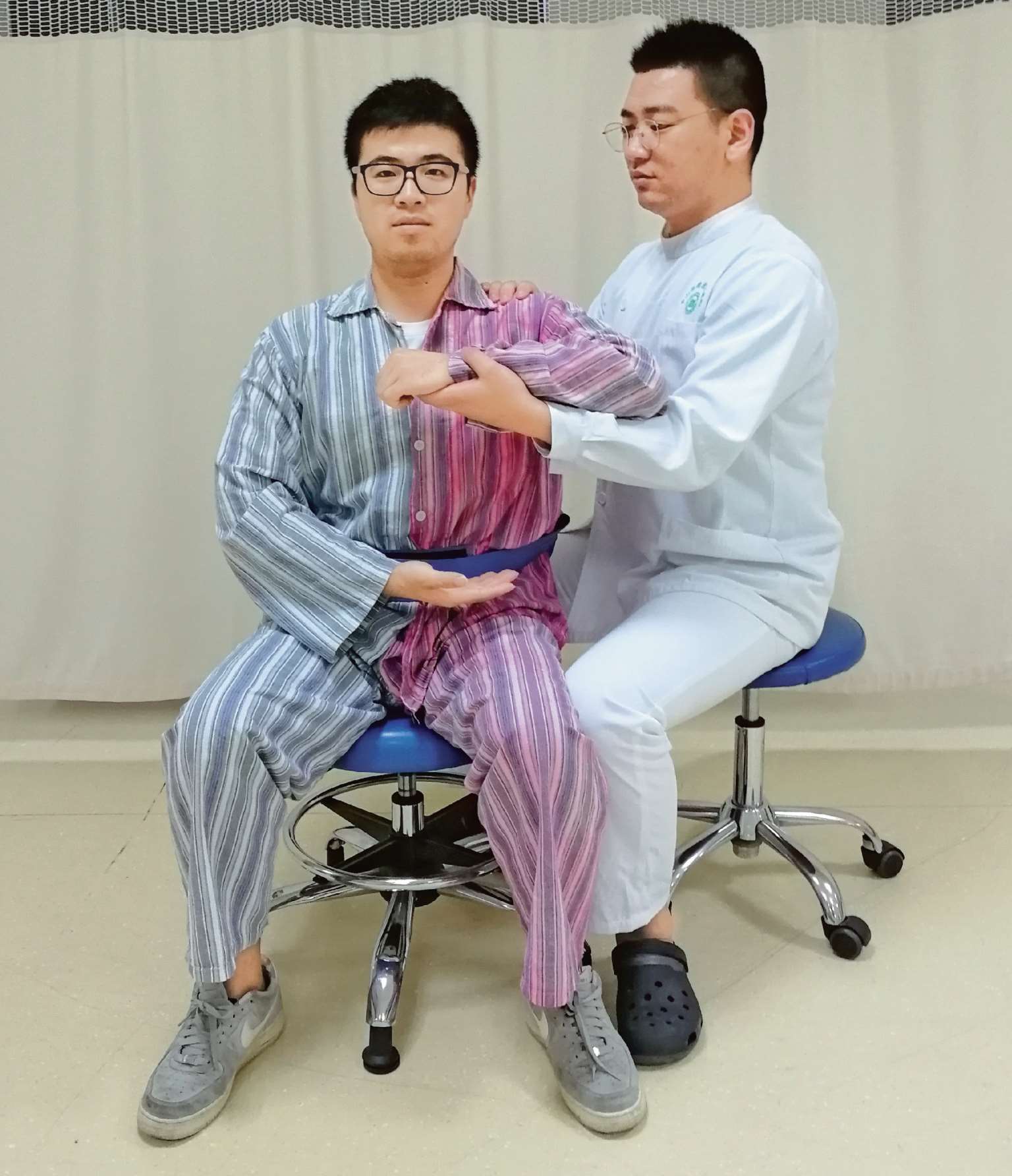 (1)准备活动:患者用健侧手托住患上肢,患侧下肢在前,呈弓步站姿,躯干中正。治疗师站于患者身后,双手扶持患者骨盆,一脚倚住患者弓步的患侧下肢,引导患者进行躯干左右的旋转,但不超过45°。