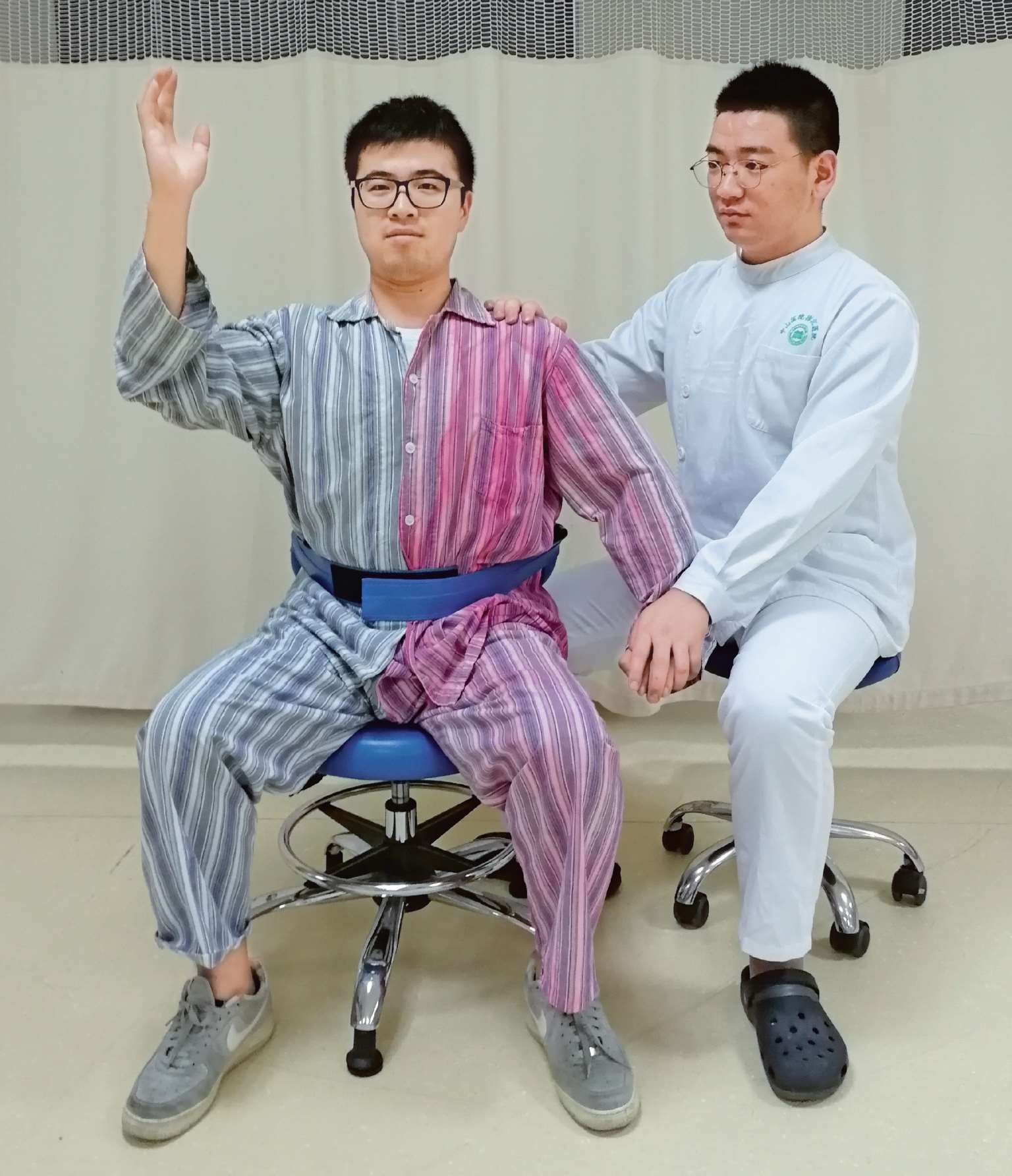 (1)准备活动:患者端坐位,先让患者体会流畅的感觉。治疗师一手控制患者胸骨柄,一手控制背部胸7处,辅助患者做躯干旋转,体会肩部向两侧的延展和躯干伸展的感觉。反复进行躯干旋转,在左右各45°之间进行训练,随患者情况改善,逐渐增加旋转幅度,直至90°。
