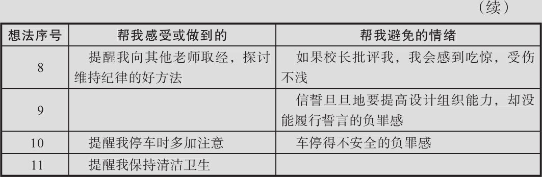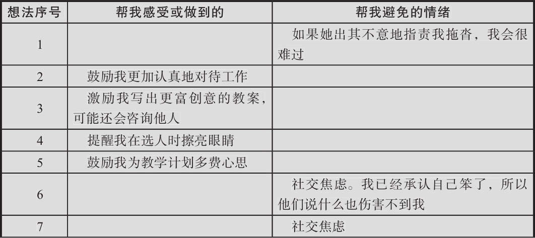 临睡前还有一个任务需要完成。在一张纸的中间画一道竖线。一边的标题为“帮我避免的情绪”,另一边的标题为“帮我感受或做到的”。然后针对每一项具体的批评,写下它的功能——它是如何被正强化或负强化的,它是让你自我感觉良好,抑或是督促你做了正事,还是驱散了你的某些负面情绪。以下是一位24岁的一年级老师所记录的内容。