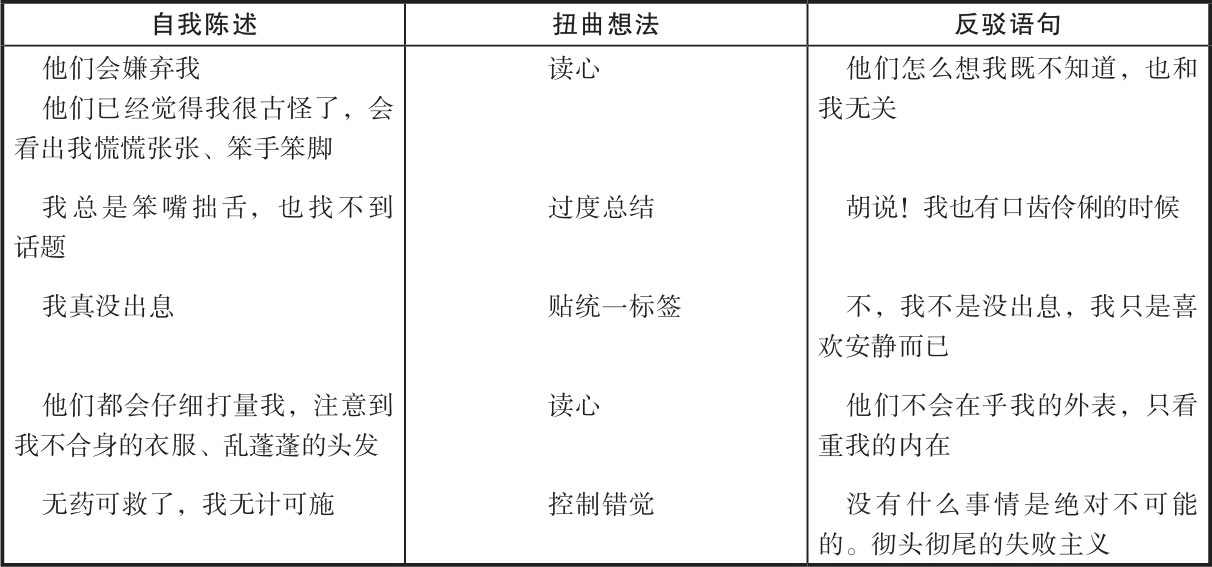 在最后一栏中,写出对自我陈述的反驳语句,做到有的放矢,依次对每一个扭曲做出具体回应。
