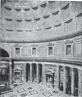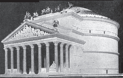 从外表看上去,万神庙并不出奇,它的表面有些发黑,前面是一排8根大柱,顶上是三角形的山墙,门楣上刻着一行字。它最重要之处在于构成其主体的那个巨大的穹顶。那圆形的屋顶直径达43米,与建筑高度相等,两千年来一直是世界上最大的穹顶之一。它巨大的内室也呈圆形,用大理石建造,更精确地说,是用大理石装饰,因为它内部的墙体乃是混凝土的。