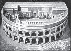 罗马人的剧场有两种:一种是像希腊人的剧场,即椭圆形只有一半,中间有一堵高墙,高墙前面的平台就是演员们表演的舞台了。这是因为演剧时演员必须面对观众,当然不适合于建成椭圆形的,那样的话就总有一半观众只能看演员的背面了。这类剧场的代表作是位于罗马城内台伯河畔的马尔采洛斯剧场,它于公元前11年左右奥古斯都统治时完成,并以他外甥的名字命名,可以容纳13500名观众。