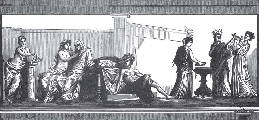 在米诺斯王宫中王后的寝宫便是这样,只见那墙上各式各样的鱼儿在悠然自在地游来游去,有黑乎乎的章鱼、尖嘴巴的海豚等,它们在飘浮着的海草里穿来穿去,仿佛这里不是米诺斯宫的墙上,而是它们在海里呢。这王后可能是个动物爱好者,所以把她的卧室也弄成了个“水族馆”。