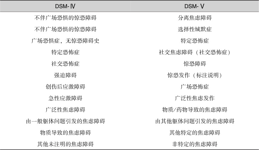 表4-4 DSM-Ⅳ与DSM-Ⅴ焦虑障碍分类比较