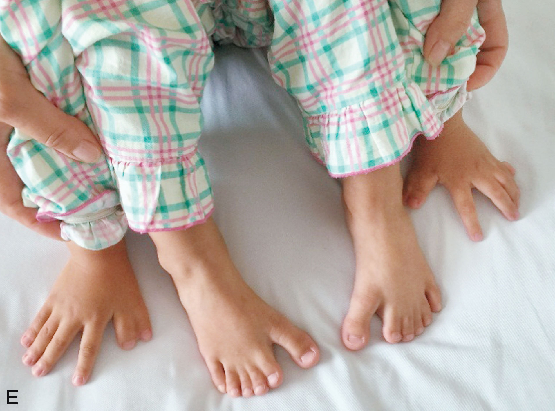 A.双侧桡尺侧多指同时存在(掌侧观),左小指漂浮指样多指,右小指肉赘样多指,双侧中环小指并指;B.背面观;C.双侧小指多指;D.双手X 线片显示骨关节畸形情况;E.同时合并足部多趾
