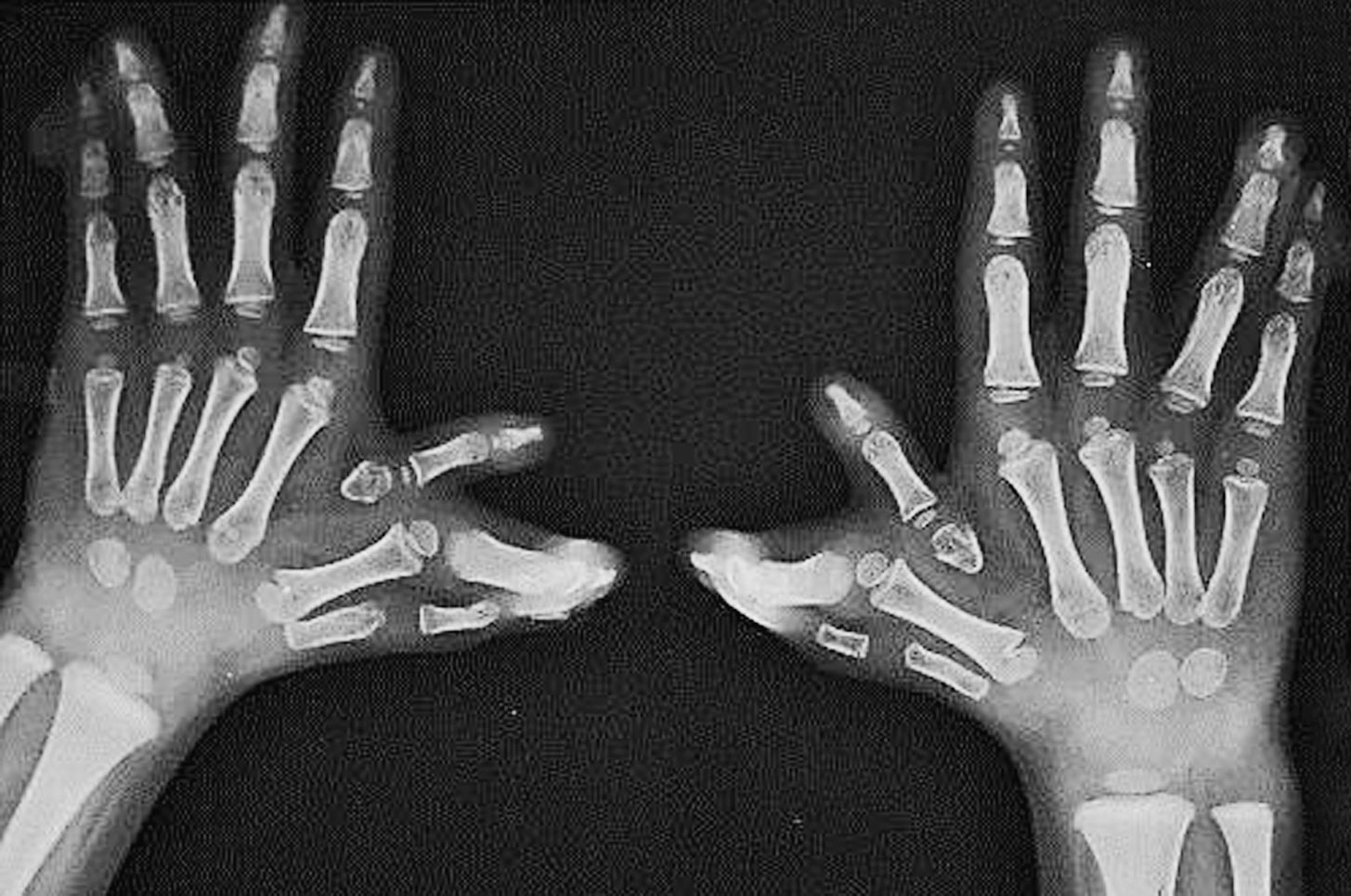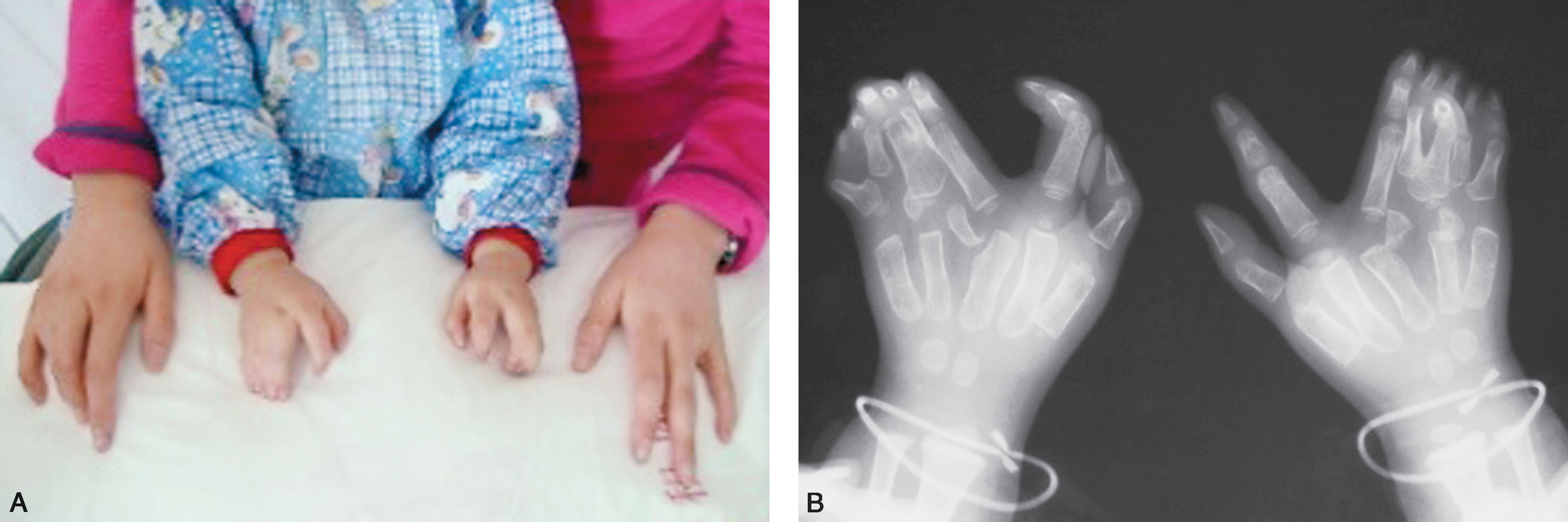 A.复杂性多并指畸形,有家族遗传史;B.X 线片显示双侧小指多指,中指多指畸形,骨关节结构严重发育紊乱