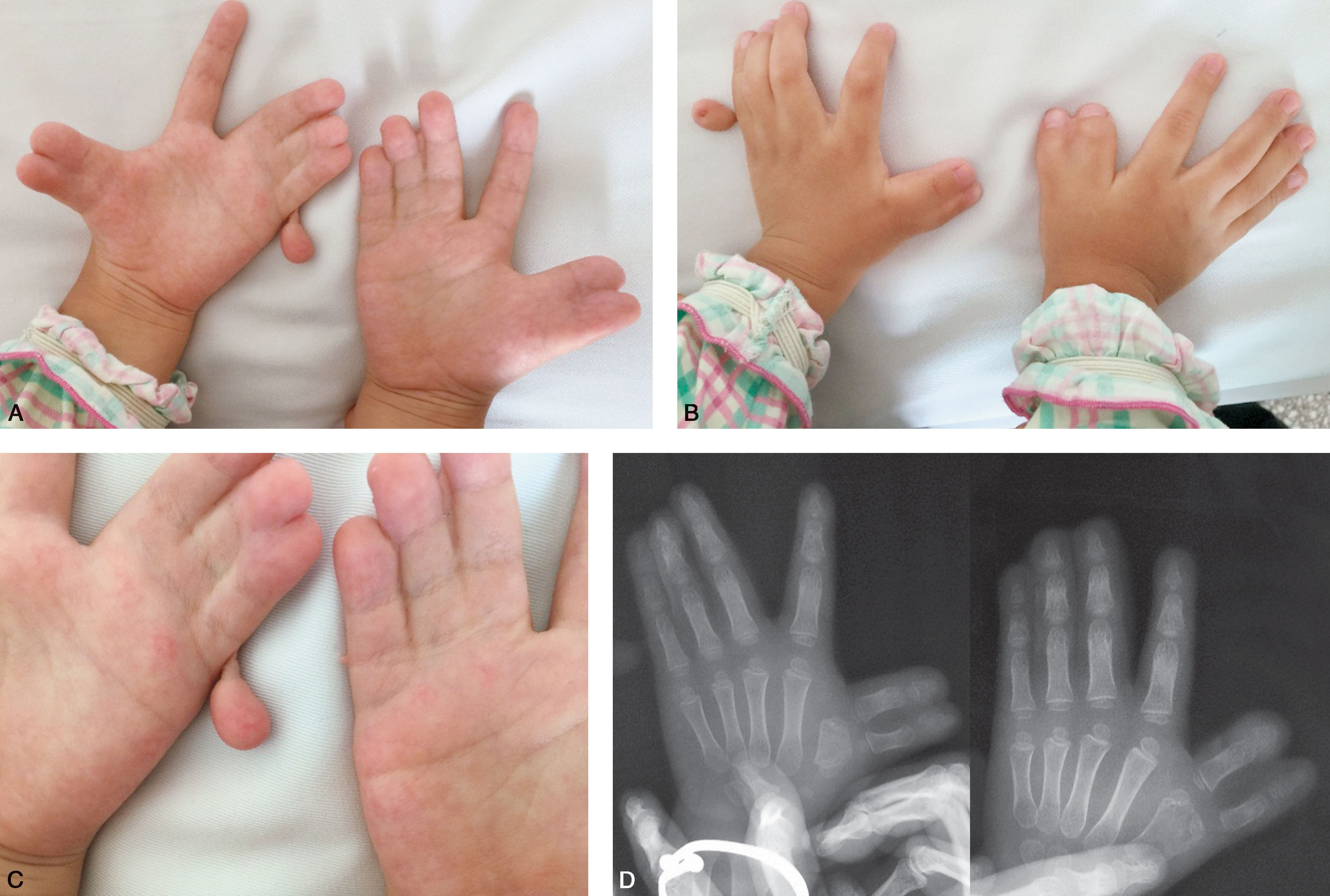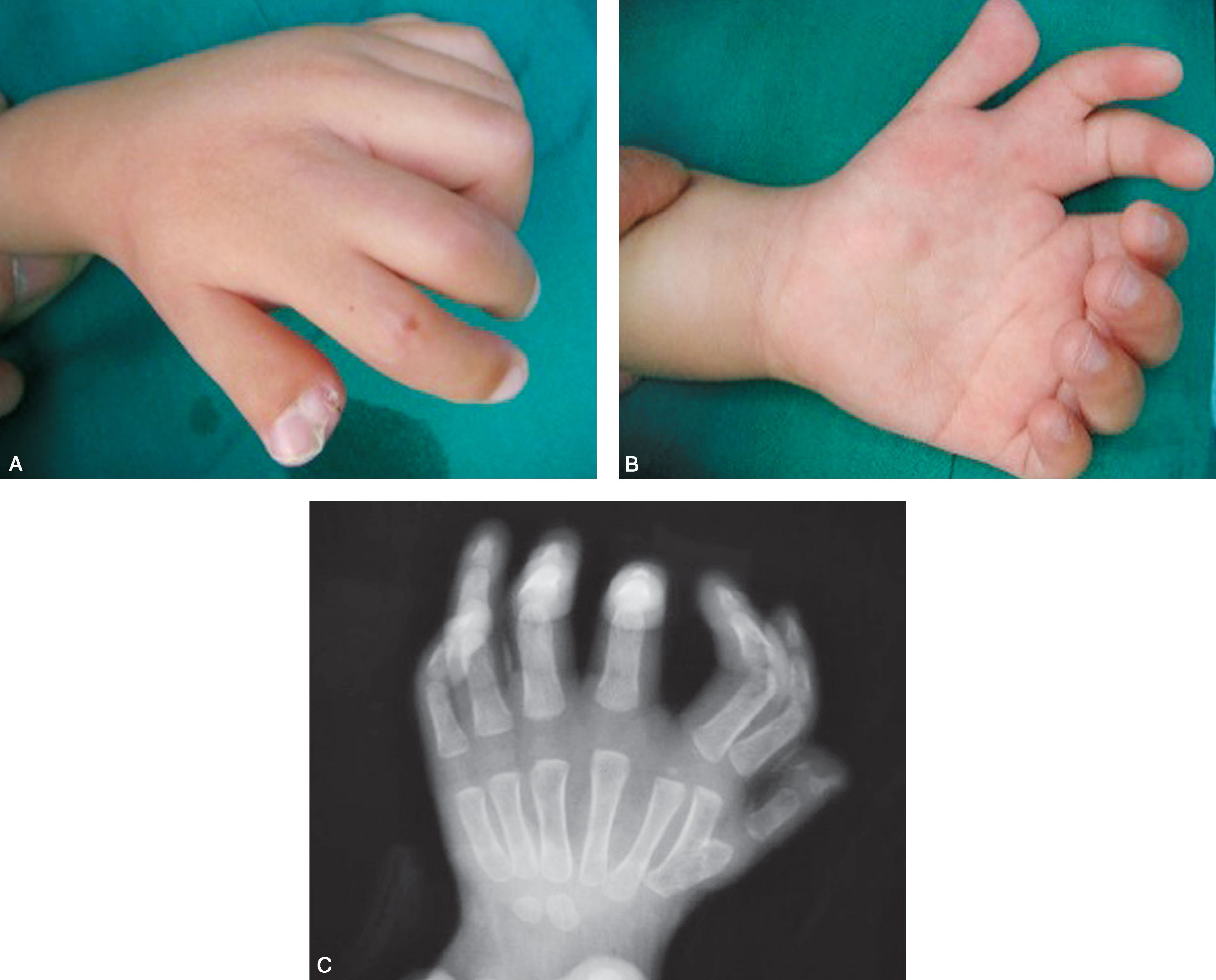 A.左手多拇指(三拇指)及中央型多指(示指);B.掌面观;C.X 线片显示,三拇指多指,示指多指