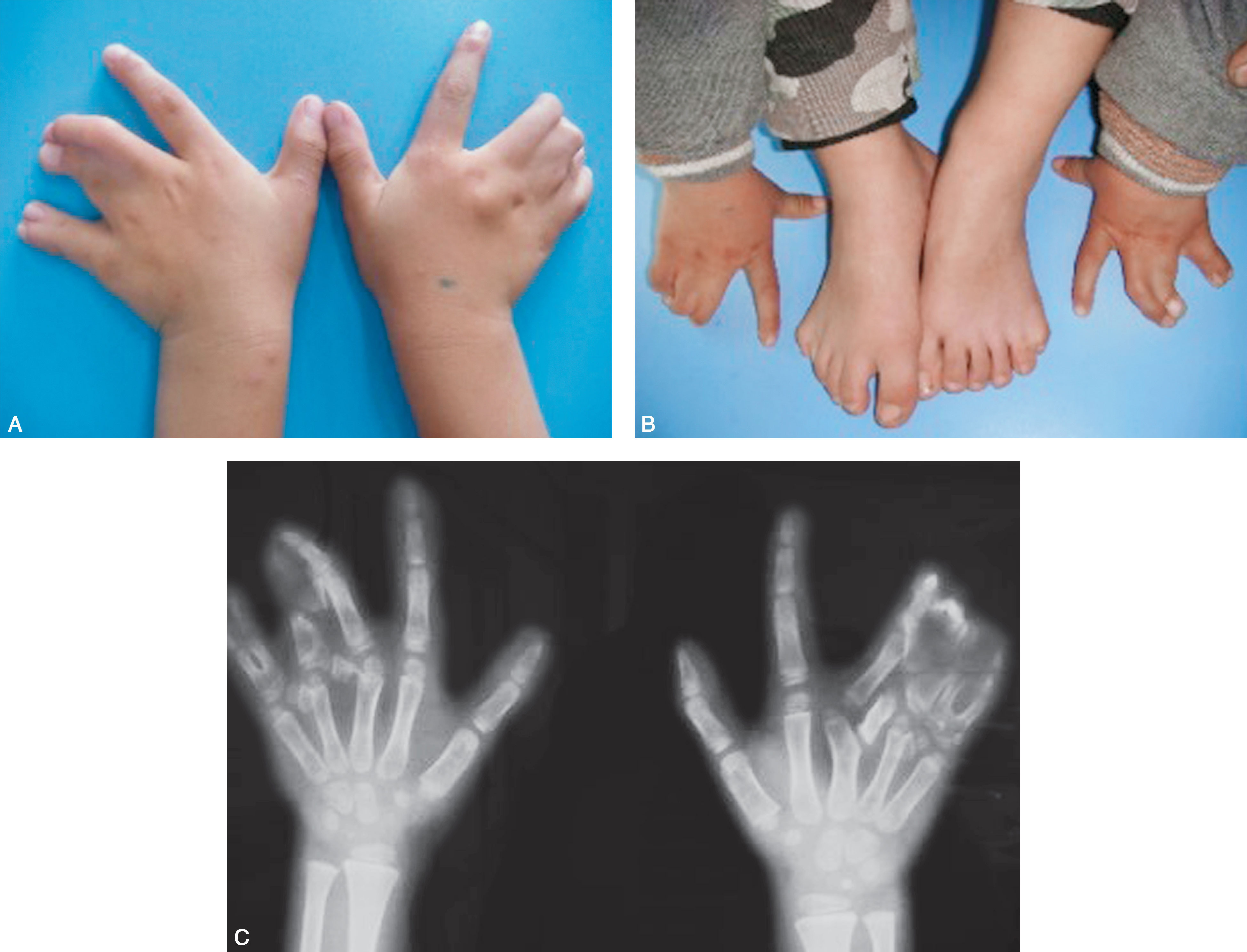 A.双手复杂性多指并指畸形,中央型与尺侧多指同存;B.同时合并足部多并趾畸形;C.X 线片显示双侧小指多指,中、环指之间可见不规则掌指骨水平隐匿性中央型多指,畸形手指骨关节结构严重发育性紊乱