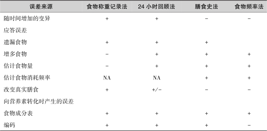 表3-10 四种膳食调查方法在估计膳食摄入量时的误差来源