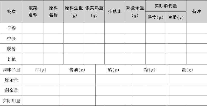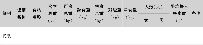指食后的残渣,如肉骨、鱼刺等不可食部分。上述称量结果均以kg为单位,分别记录于表3-2中。