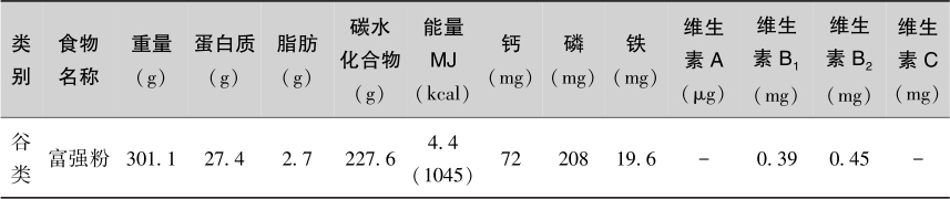 (4)平均每人每日各种营养素摄取量:平均净食重乘以食物成分表中单位重量中各种营养素含量,即得每种食物中各种营养素含量。如301.1g富强粉中蛋白质、脂肪和糖的含量计算。查食物成分表中富强粉(江苏)得知100g中含蛋白质9.1g、含脂肪0.9g、含糖类75.6g。则: