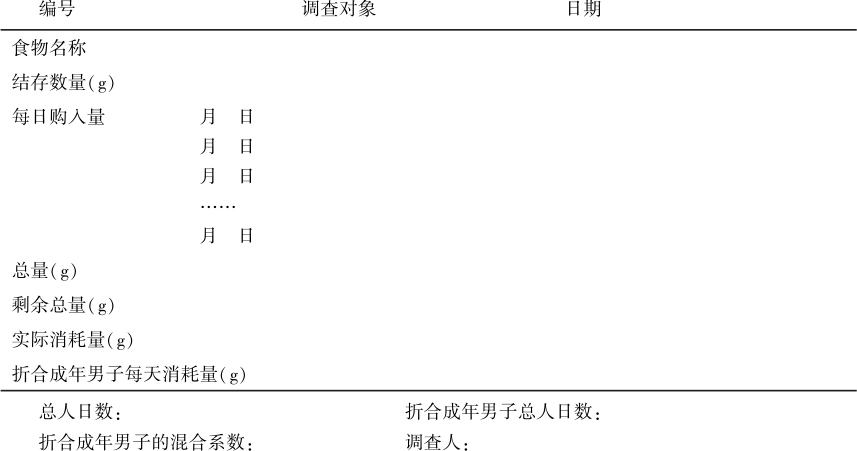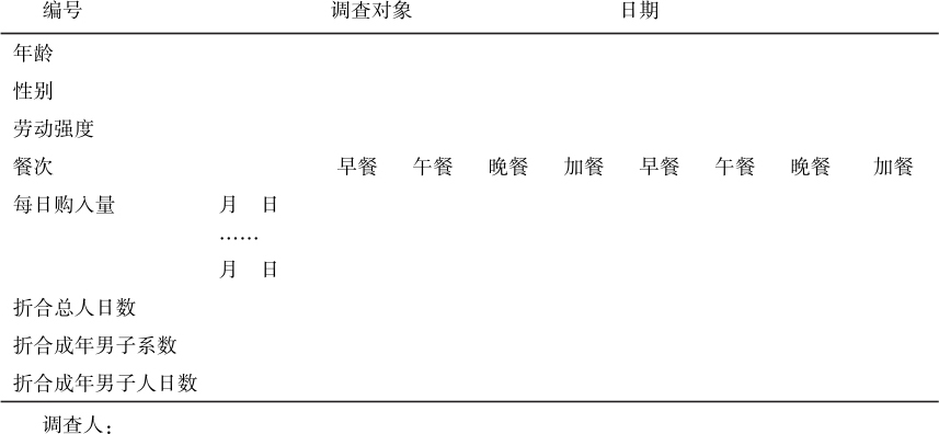 记账法的优点是操作相对简单,费用低,所需人力少,与称重法相比适用于大样本膳食调查,且膳食管理人员容易掌握并使用该方法,调查单位可以根据情况定期地自行进行调查计算,并以此作为改进膳食质量的参考。该法不仅适用于家庭调查,也适合于幼儿园、学校或部队的调查。记账法时间长短根据研究项目的需求而定,可以调查较长时期的膳食,如1个月或更长。有些研究为了了解慢性病与饮食的关系,可采用长达一年的膳食记录方法。在记录精确和每餐用餐人数统计确实的情况下,能够得到较准确的结果。与其他方法相比较,不但可以调查长时期的膳食,而且适合于进行全年不同季节的调查。缺点是调查结果只能得到全家或集体中人均的膳食摄入量,难以分析个体膳食摄入情况。具体调查内容见表3-4和表3-5。