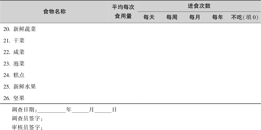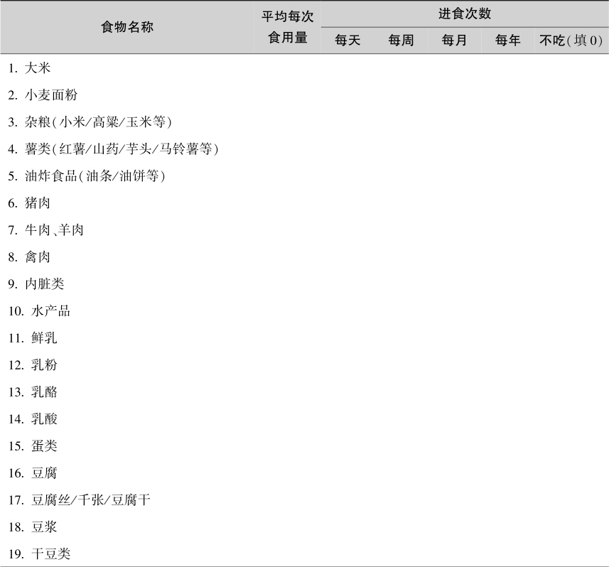 食物频率法的优点是能够迅速得到被调查者平时食物摄入的种类、频率及每次摄取的平均估计量,反映了长期营养素的摄取模式,调查方法简单且费用低,在流行病学研究中可以用来研究膳食与疾病之间的关系;缺点是需要对过去的食物进行回忆,应答者的负担取决于所列食物的数量、复杂性以及量化不准确。另外,编制、验证食物表会需要一定时间和精力;该法不能提供每天之间的变异信息;具有特定文化习俗地区人群的食物具有特殊性,在所列食物表中没有,因此,对人群不同亚群组该法的适用性是有疑问的;较长的食物调查表、较长的回顾时间经常会导致摄入量偏高;而且对回答有关食物频率问题的认识过程可能十分复杂。也发现当前的食物模式可能影响过去的膳食回顾,从而产生偏倚,准确性差。调查表格可参考表3-9。
