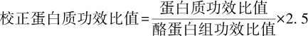 同一食物在不同实验条件下,所测的功效比值往往差异较大,为了使实验结果具有一致性和可比性,因此所得结果需要校正处理,用标化的酪蛋白作为对照,将酪蛋白功效比值均换算为2.5,所测蛋白质的校正功效比值为: