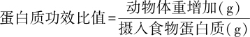 生物体是一个复杂的有机体,依靠前述的化学方法进行蛋白质营养价值评价存在较大误差。蛋白质功效比值是指实验期内,处于生长阶段的幼年动物(一般选用刚断奶的雄性大鼠),以含10%待测蛋白质的膳食喂养28天后,计算出平均每摄入1g蛋白质所增加的体重克数。即试验动物体重增重与摄入的蛋白质质量之比。由于待测蛋白质主要用于提供生长发育的需求,所以,该指标被广泛用于婴幼儿食品中的蛋白质评价。