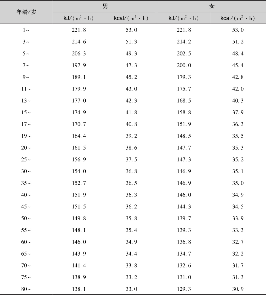 基础代谢率可按性别、年龄查表获得,人体正常基础代谢率见表2-1。