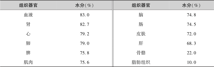 人体内水分主要分布在细胞内和细胞外。细胞内液聚集在细胞膜内,约占人体内总水分的2/3。细胞外液又被称为体液,约占人体内总水分的1/3。细胞外液又可分为三部分:血管内液体,指动脉、静脉和微血管内的血浆;组织间液,指血液以外存在于细胞间隙中的液体;其他液体,如淋巴、脑脊液等有特殊作用的液体。水在人体内各组织器官的分布差别较大,其中以血液最多,具体分布见表2-11。