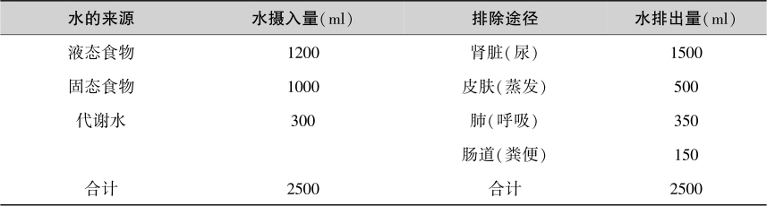 在正常情况下,水经由皮肤、呼吸道以及尿和粪便的形式排出体外,应补充相当数量的水,才能维持动态平衡,也就是说水的摄入量和排出量应基本保持相等,称为“水平衡”。水的摄入和排出大约维持在2500ml/d,具体见表2-12。