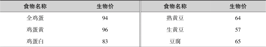 食物蛋白质的生物价高,表明食物蛋白质的必需氨基酸比值与人体必需氨基酸比值接近,食物蛋白质中的氨基酸主要用于合成人体蛋白质,极少有过多的氨基酸经肝、肾代谢而释放能量或由尿排出多余的氮,从而减轻肝肾负担。故蛋白质生物价对肝、肾病病人的膳食具有重要指导意义。常见的食物蛋白质的生物价见表2-3。
