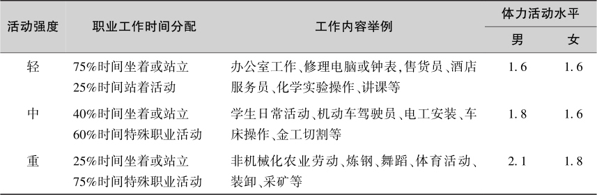 中国营养学会专家委员会在世界卫生组织的基础上,将中国成年人体力活动强度按照身体活动水平(physical activity level,PAL)分为三级:轻体力活动、中体力活动、重体力活动。详见表2-2。