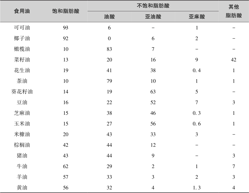 脂肪酸按其饱和程度可分为饱和脂肪酸(saturated fatty acid,SFA)和不饱和脂肪酸(unsaturated fatty acid,USFA),饱和脂肪酸的碳链中没有不饱和键,不饱和脂肪酸含有一个或多个不饱和双键。不饱和脂肪酸又可分为单不饱和脂肪酸(monounsaturated fatty acid,MUFA)和多不饱和脂肪酸(polyunsaturated fatty acid),最多见的单不饱和脂肪酸是油酸(oleic acid),膳食中最主要的多不饱和脂肪酸为亚油酸(linoleic acid)和α-亚麻酸(linolenic acid),主要存在于植物油中。人体细胞中不饱和脂肪酸的含量是饱和脂肪酸的两倍,但各种组织中两者的组成有很大差别,在一定程度上与膳食中脂肪的种类有关。