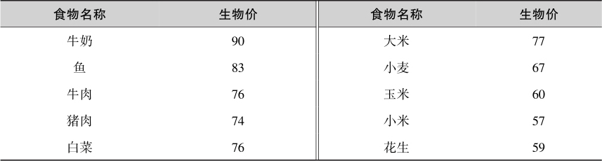 是反映食物蛋白质吸收后,被机体利用程度的指标。生物价越高,表明食物蛋白在体内利用率越高,营养价值也越高,最大值为100。其优点是能直接反映出供试动物对待测蛋白质的消化、吸收及利用状况,缺点是费时,且需要经过繁琐的过程。