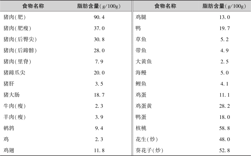 脂类(lipids)是脂肪(fat)和类脂(lipoid)的总称,其共同特点是难溶于水而易溶于有机溶剂。人类脂类总量约占体重的10%~20%。脂肪是由甘油(glycerin)和脂肪酸(fatty acids)组成的甘油三酯(triglycerides),约占体内脂类总量的95%,是体内重要的储能和供能物质,类脂主要包括磷脂(phospholipids)和固醇类(sterols),约占全身脂类总量的5%,是细胞膜、机体组织器官,尤其是神经组织的重要组成成分。除了作为人体组织的重要组成成分,脂类也是重要的食物成分,烹饪时赋予食物特殊的色、香、味,增进食欲,适量摄入对满足机体生理需要,促进维生素A、维生素E等脂溶性维生素的吸收和利用,维持人体健康发挥重要作用。