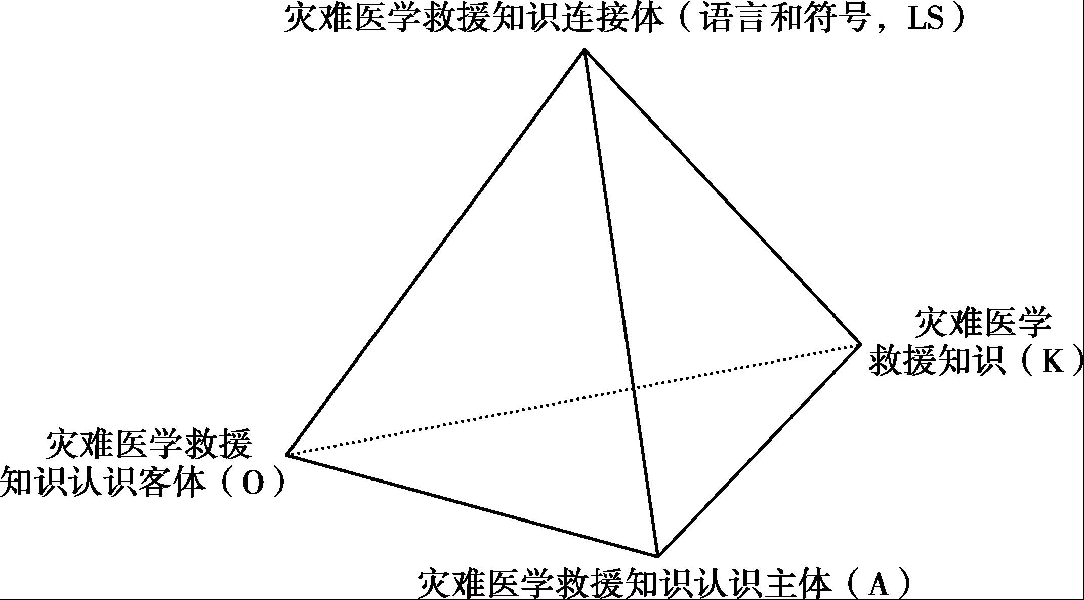 董光璧认为,知识认识具有四面体结构。由认识主体(以科学家为主,记作A)、认识客体(记作O)、认识结果(即包括科学知识在内的各种知识,记作K)和作为前三者联系媒介的语言和符号(这里的符号是广义的,包括各种图形和文字,记作LS)组成,灾难医学救援知识认识结构也不例外,形成图3-2所示的知识认识结构。四面体的底面A-O-K(灾难医学救援知识主体-灾难医学救援知识-灾难医学救援知识客体)代表知识认识的基础平台;平面A-LS-O(灾难医学救援知识认识主体-灾难医学救援知识连接体-灾难医学救援知识客体)代表知识主体经由语言和符号表达的认识过程;平面A-LS-K(灾难医学救援知识认识主体-灾难医学救援知识连接体-灾难医学救援知识)代表认识主体经逻辑或非逻辑推理得到的结果;平面K-LS-O(灾难医学救援知识-灾难医学救援知识连接体-灾难医学救援知识认识客体)代表知识和认识客体间经由语言和符号的表达和解释关系。对于基础平台和三条连线的关系,可做出这样的解释:连线A-O和相对的顶点K,反映知识和认识主体和认识客体发生关系的结果;连线A-K和相对的顶点O,反映客体是认识主体和认识结果间的桥梁;连线K-O和相对的顶点A,反映客观世界的事物经认识主体的思维活动生成属于“世界3”的客观知识。