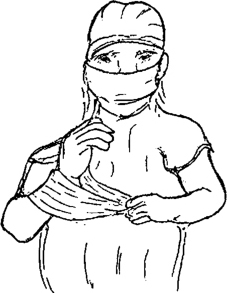 手术人员首先在更衣室更换手术室专用的清洁短袖衣、裤子、鞋和帽子、戴口罩。注意将衣袖卷至肘上15cm的上臂便于洗手,头发尽可能被帽子盖住。口罩必须盖住鼻孔(图1-1)。术中尽量少说话,注意口罩湿透要更换。术者过度疲劳、情绪不佳等不宜参加手术。