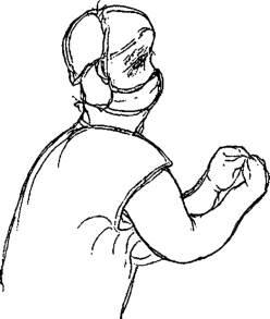 取手术衣,轻抛起手术衣,双手伸入袖内,展开手术衣,巡回护士协助拉衣领并结扎衣领带及内片腰带。戴无菌手套后,递右手腰带上纸卡片的一端给器械护士,或将腰带递给巡回护士,用无菌持物钳夹持。将腰带绕过背后使手术衣的外片遮盖上内片,将腰带递给术者,同时取下纸卡片遮盖上内片,术者结扎腰带,穿衣完毕(图1-5)。穿手术衣的过程中容易犯的错误:衣服抛得太高、双手外展、没有前倾、没有交叉手去提腰带,要引以为戒。