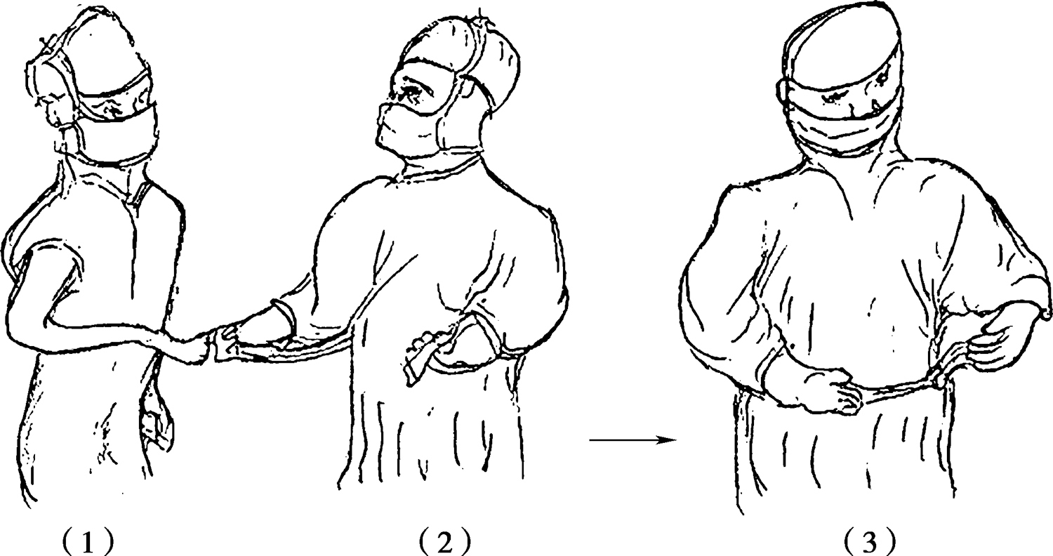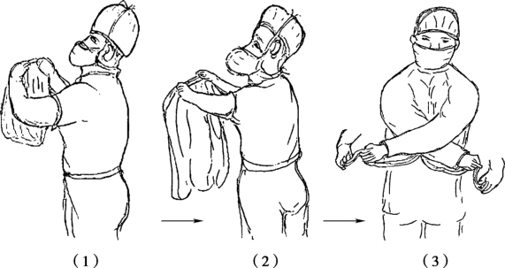 从无菌衣物包中取出一件手术衣,注意不要触及未消毒的物品,提取衣领两角,面向器械台,轻轻地抖开手术衣,随即将手术衣向空中轻抛(不能超过头部),双手就势插入衣袖内,两臂前伸,由巡回护士在背后协助拉好衣服,稍前倾使腰带向前垂,双手交叉提起对侧腰带、直立,由巡回护士在身后系好(图1-4)。