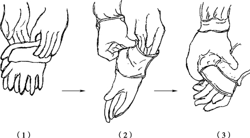 手术人员洗手后各种手臂的消毒方法,都不能保证手臂的绝对无菌。因此,必须戴无菌手套进行手术。双手捏住手套夹内边并提起,用左手自手套袋内捏住手套袖口翻折处,将两手套取出,先用右手插入右手手套内,再用已戴上手套的右手插入左手套的翻折处,不可触及左手皮肤,帮助左手插入左手套内,再将手套翻折处上翻包住手术衣的袖口(图1-6),冲去手套上的滑石粉。戴手套时容易犯的错误:手未干戴不进,手指接触了手套外面,手套腕部没有覆盖手术衣袖,戴手套时举手过高或过低,均应引起注意。
