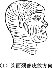 为愈合后不影响生理功能,有利于术后功能及外形恢复,切口应避开负重部位,关节部位切口应避免垂直通过,以免术后瘢痕挛缩影响关节活动。颜面及颈部切口应顺皮纹或皱纹线进行(图2-3),以减少或减轻愈合后的瘢痕。根据需要也可顺轮廓线切开。