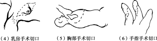 任何切口都会损伤到一定的组织,尽量避开血管和神经。因此,乳房手术要选择以乳头为中心的放射状切口,以保护乳腺小叶及乳腺管;而乳晕区,应沿乳晕边缘做弧形切口,以保护在乳头下汇结成束的乳腺管;如乳房后脓肿在乳房下缘,沿皮肤皱襞做弧形切口(图2-2)。