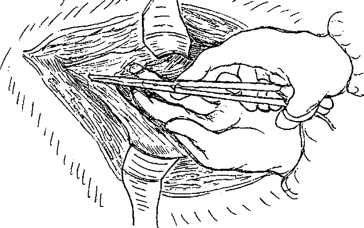 腹部或其他较大切口时,为了减少切口污染,可将两块无菌巾或纱垫用组织钳或布巾钳固定于皮下组织层(图2-6)。如手术时间长可将无菌巾或纱垫缝合固定于皮下组织(图2-7)。切开组织应按不同层次逐层切开,重要部位更应仔细切割,防止滑刀和偏刀,切开腹膜时应妥善保护,以防损伤内脏和大网膜(图2-8)。