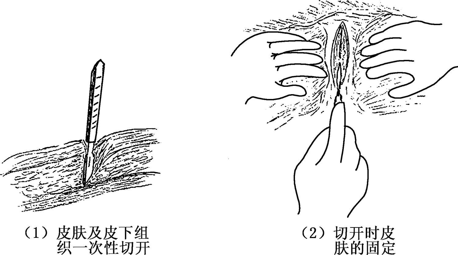 选择适当的手术刀,以为不同部位的组织切开带来便利。根据切开部位、切口长短、手术刀大小,选择正确的执刀方法。切开皮肤和皮下组织时,应先用左手将局部皮肤固定,使将被切开的皮肤稍紧张,右手持手术刀,刀片要与皮肤表面垂直,刀柄与皮肤表面所成的角度大约为45°,左右用力均匀、适当,用刀肚切开,边缘可用刀尖一次性切开皮肤及皮下脂肪组织,避免来回多次切割和斜切。当切开带毛发部位时,应顺毛根方向切入,以避免损伤毛囊,减少术后秃发(图2-4)。切开时用左手示指、拇指固定切口皮肤,必要时助手固定切口处皮肤(图2-5)。