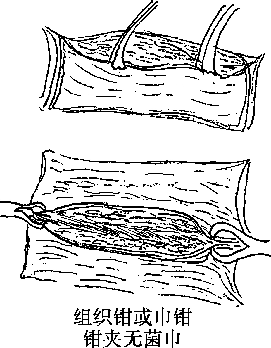 腹部或其他较大切口时,为了减少切口污染,可将两块无菌巾或纱垫用组织钳或布巾钳固定于皮下组织层(图2-6)。如手术时间长可将无菌巾或纱垫缝合固定于皮下组织(图2-7)。切开组织应按不同层次逐层切开,重要部位更应仔细切割,防止滑刀和偏刀,切开腹膜时应妥善保护,以防损伤内脏和大网膜(图2-8)。