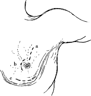 a.放射状切口;b.沿乳晕弧形切口;c.沿皮肤皱襞弧形切口