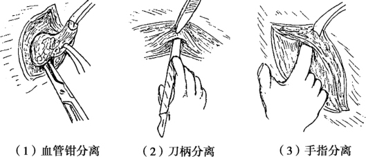 多用于组织间隙疏松的结缔组织或粘连的分离或良性肿瘤及实质脏器经包膜外间隙的游离。钝性分离常用血管钳、血管钳夹小纱布团、刀柄、组织剪及手指进行分离(图2-11)。