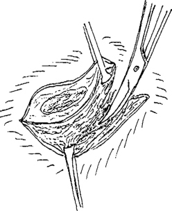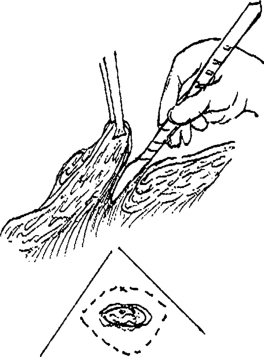 轻轻地张开剪刀锐性分离,视察所分离范围内无重要组织后,将浅层的组织剪开。
