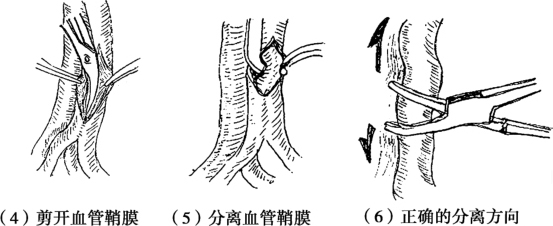 用手术刀或组织剪等锋利器械进行解剖分离,可直接将组织切开或剪开,常用于腱膜、鞘膜和瘢痕等较致密的组织剥离,该法对周边组织损伤较小,但必须直视下进行,且精细、准确地做短距离切开,再逐步扩大分离面,逐层深入解剖以减少出血及避免损伤深部的组织器官。