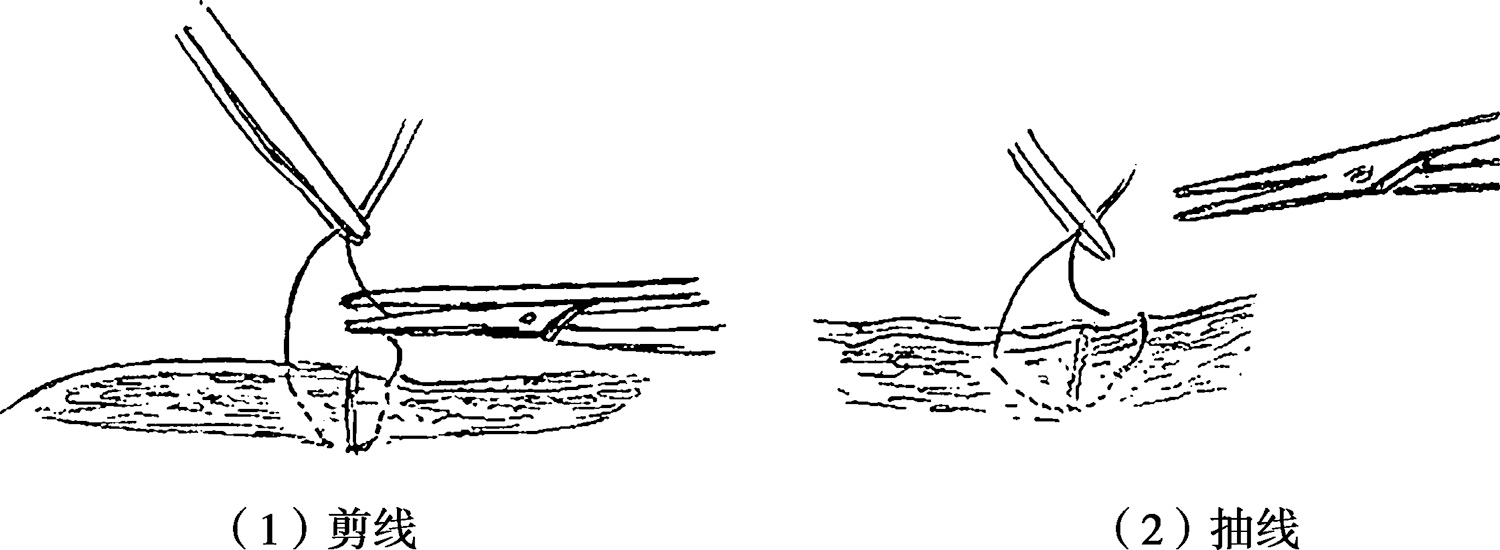 当切口组织已达有机结合后,皮肤缝线需要拆除。拆除缝线的时间,要根据切口的性质、缝合时的张力、缝线的种类、组织愈合能力等因素而定。一般情况下,头颈部术后4~5天拆除,躯干部术后7~8天拆除,四肢的缝线术后10天后拆除。减张缝线9~10天后拆除。老年患者、营养不良等可推迟拆线时间后间断拆线。拆线的具体方法是先按换药的常规方法消毒切口区域,左手持镊子将线结轻轻地提起使埋入皮肤内的一小段缝线稍露出,右手将微微张开的线剪插入线结与皮肤之间的间隙,紧贴针眼处的皮肤将线剪断,然后迅速轻巧地将缝线牵拉出,这样可避免拉开切口,造成患者不适或皮下污染(图2-25)。最后用酒精棉球消毒切口,覆盖无菌纱布,胶布固定。