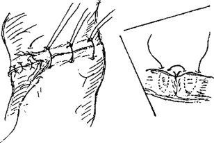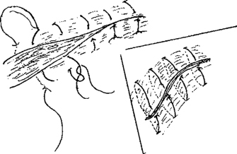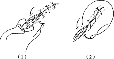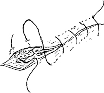 其缝合法与内翻缝合相反,缝合结扎后显示出缝合边缘外翻,结果形成外翻内面光滑,常用于松弛的皮肤缝合(如老年或阴囊及产妇腹部皮肤等)、腹膜缝合、减张缝合及血管吻合等。①间断垂直褥式外翻缝合法:常用于松弛的皮肤缝合,缝合时先距皮肤边缘1cm皮肤进入,经皮下组织垂直横过切口至对侧距皮肤1cm处穿出,再于穿出侧距切口皮缘2mm穿入皮肤之皮下,至对侧距皮缘2mm处进入穿出皮肤,结扎后切口两侧的皮缘外翻(图2-23),但要防止皮缘内陷而影响愈合。②连续外翻缝合法:适用于缝合腹膜及血管的吻合。在血管吻合术中多用于血管后壁的缝合,自管腔外开始刺入管腔内,再由对侧管腔内穿出,于距离1~1.5mm处再向相反方向进针(图2-24),两端与固定血管的缝线结扎,针距可根据血管动静脉直径作相应调整,并选择好缝合血管的针线。