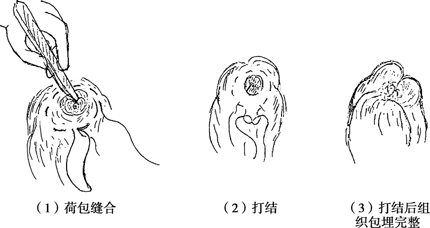 (3)结扎的张力要适当。缝合线结扎过紧易将缝合组织切割,使绑扎组织缺血坏死,愈合后形成明显的“十”字缝合线瘢痕。因组织的愈合不是靠缝合线的绑扎,而是借助缝合线的暂时拉拢,使组织间产生纤维性的粘连而愈合。因此,缝扎线的松紧度掌握适度,有利于创口的愈合。