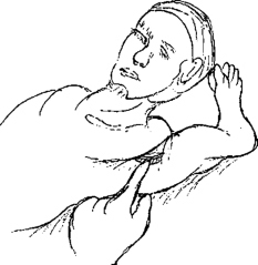 该麻醉方式多用于前臂以下部位的手术,有腋窝和锁骨上两种入路,最常使用也较为安全的为腋窝入路法。将患者上臂外展,肘关节屈曲,此时臂丛神经被牵拉固定,腋动脉移到最表浅位置,沿肱骨上端紧靠胸大肌外侧缘触及腋动脉搏动(图2-36)。在其最高处先做一皮丘浸润麻醉,再用7号针进1.0~1.5cm阻力感消失即表示进入腋鞘管,上肢出现触电感,松开穿刺针可见针尾随腋动脉的搏动明显摆动,这是定位的正确重要标志。回抽无血后注药10~20ml。注意穿抽时出血应退出针头压迫止血。