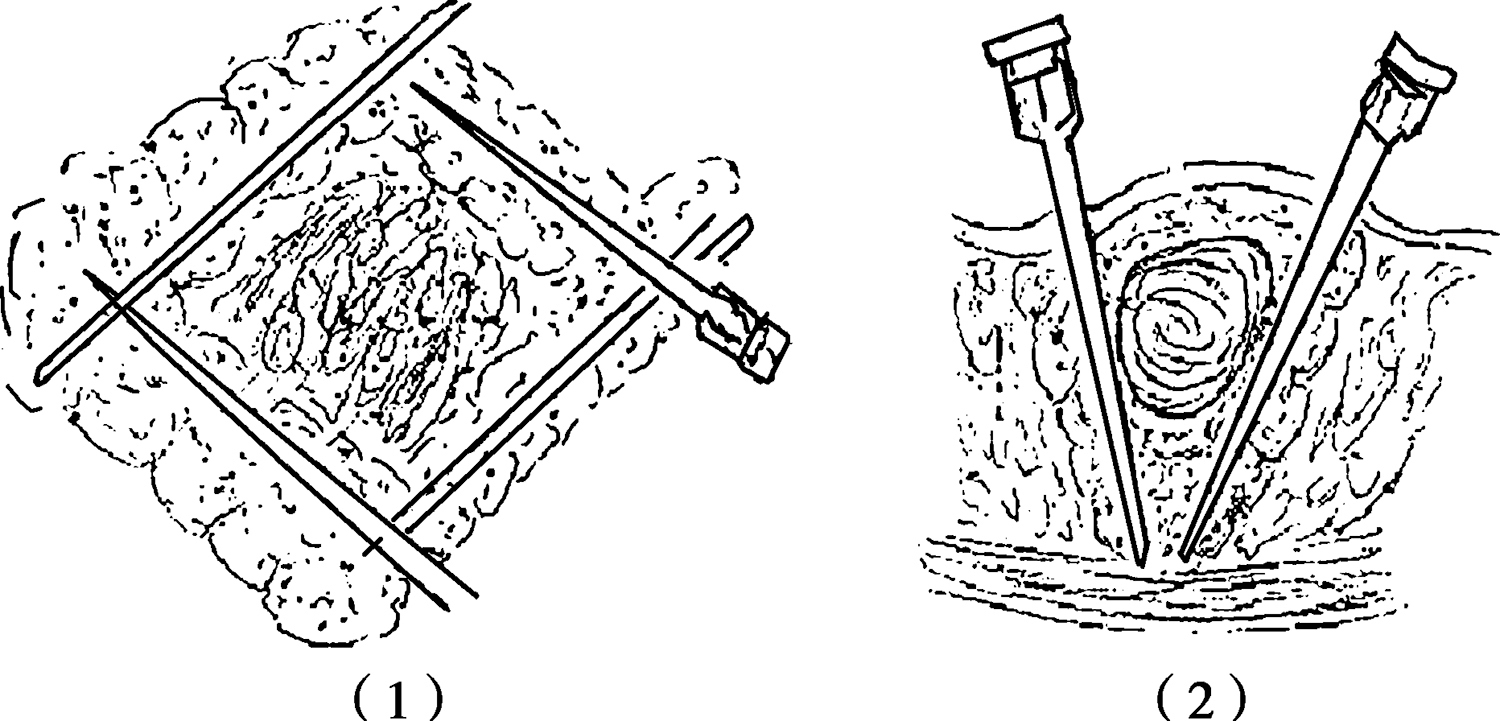 先做一小皮丘,然后在病灶周围皮内或紧贴真皮下利用“一针技术”注射一环形带,再于病灶周围皮下组织、肌肉等其他组织和基底注入药,围绕着病灶形成一个注入的麻醉药包围圈(图2-27)。